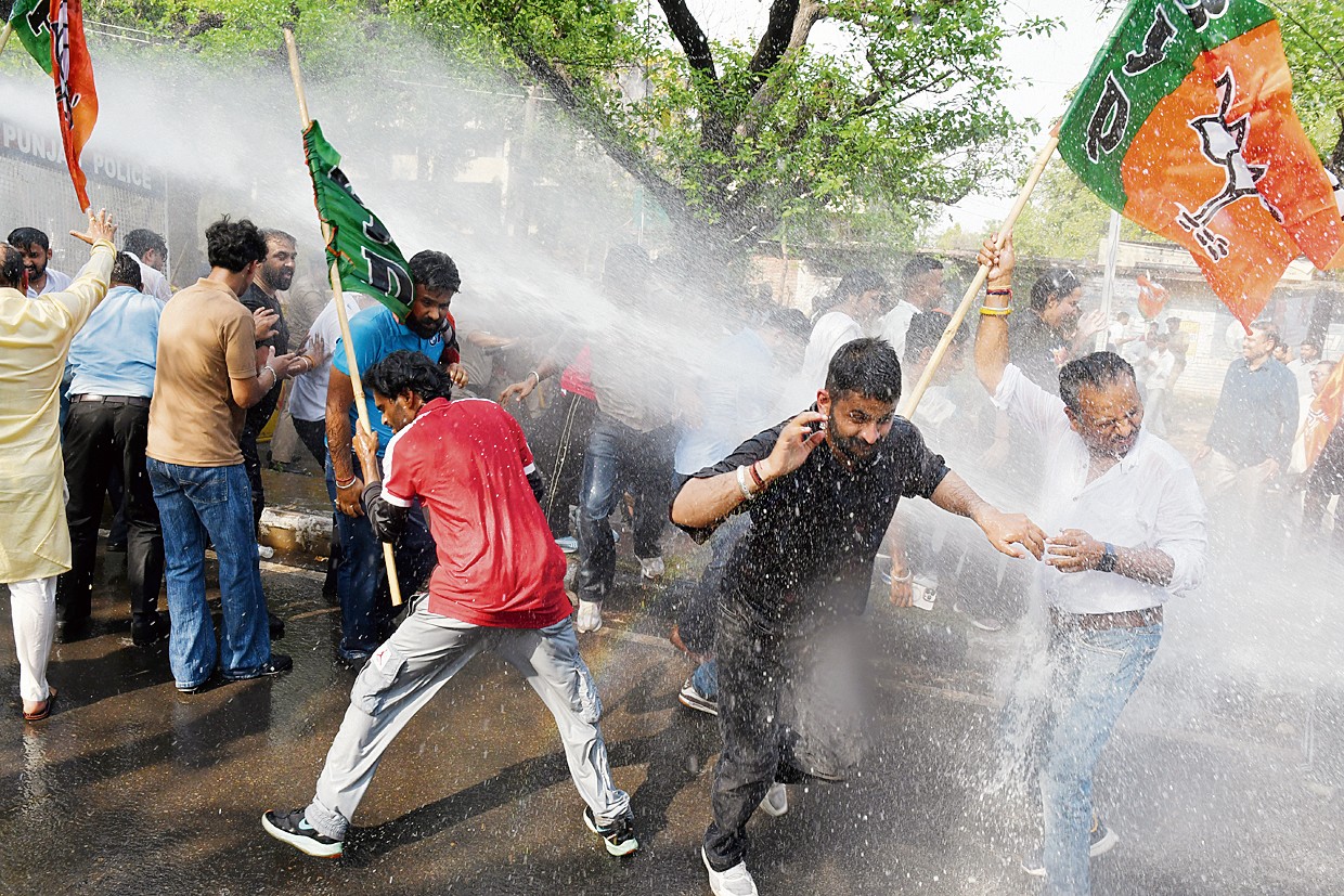 नेशनल हेराल्ड मामले को लेकर शुक्रवार को भारतीय जनता युवा मोर्चा (भाजयुमो) ने चंडीगढ़ में कांग्रेस के खिलाफ जोरदार प्रदर्शन किया। सेक्टर-33 स्थित भाजपा कार्यालय से शुरू हुआ यह मार्च कांग्रेस भवन तक पहुंचने की कोशिश थी, लेकिन बीच रास्ते में पुलिस ने वाटर कैनन से प्रदर्शनकारियों को रोकने का प्रयास किया।