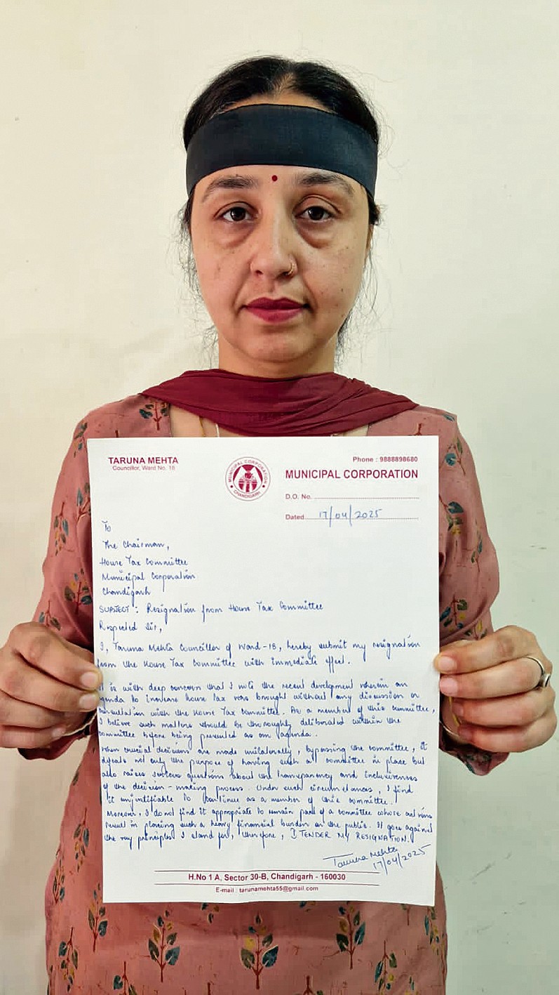 चंडीगढ़ में बढ़े प्रॉपर्टी टैक्स के विरोध में बृहस्पतिवार को नगर निगम की हाउस टैक्स कमेटी की मेंबर एवं डिप्टी मेयर तरुणा मेहता ने कमेटी से इस्तीफा दे दिया। तरुणा मेहता ने कहा कि अब इस कमेटी का और मीटिंग का कोई औचित्य ही नहीं रहा जहां पहले ही तीन गुना प्रॉपर्टी टैक्स के रेट बढ़ा दिए गए हैं। उन्होंने कहा कि मेयर द्वारा हाउस में एजेंडा लाने से पहले इस हाउस टैक्स कमेटी में इसकी डिस्कशन क्यों नहीं हुई? भाजपा ने पूरी प्लानिंग के साथ हाउस टैक्स कमेटी में यह एजेंडा न लाकर और मेयर द्वारा हाउस की मीटिंग में प्रॉपर्टी टैक्स बढ़ाने का एजेंडा लाकर पूरी प्लानिंग के साथ रिजेक्ट कर प्रशासन का कानूनी तौर पर रास्ता साफ किया ताकि प्रशासन खुद अपनी मनमर्जी से टैक्स लगा सके।