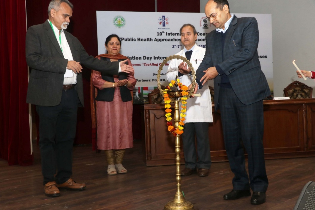 PGIMER चंडीगढ़ में '10वें इंटरनेशनल कोर्स ऑन पब्लिक हेल्थ अप्रोचेस टू NCDs' के तहत विशेषज्ञों ने बताया कि भारत सरकार ने "75 बाय 25" योजना शुरू की है, जिसके तहत 2025 तक 7.5 करोड़ लोगों की डायबिटीज और हाई बीपी की स्क्रीनिंग व इलाज किया जाएगा। WHO के डॉ. युतारो सेटोया ने बताया कि मानसिक स्वास्थ्य और हाइपरटेंशन के बीच सीधा संबंध है। नीति आयोग और हेल्थ एक्सपर्ट्स ने हाइपरटेंशन व डायबिटीज की रोकथाम के लिए नया पब्लिक हेल्थ मॉडल अपनाने पर जोर दिया।