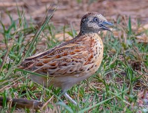 यह एक छोटा, चपल, गोल-मटोल, काला-भूरा धारीदार स्थानीय पक्षी है जो वर्षा ऋतु में प्रजनन के दौरान अपनी अनूठी ‘चिक चिक’ की ऊंची आवाज के लिए जाना जाता है। नर के चेहरे पर काली सफेद पट्टियां और छाती पर तिकोना काला धब्बा इसे एक विशिष्ट पहचान देता है। घास के मैदानों और छोटी फसलों के बीच छिप कर रहती है और खतरा भांपने पर दुबक जाती है। अधिक पास जाने पर छोटी फर्राटेदार उड़ान भरती है।