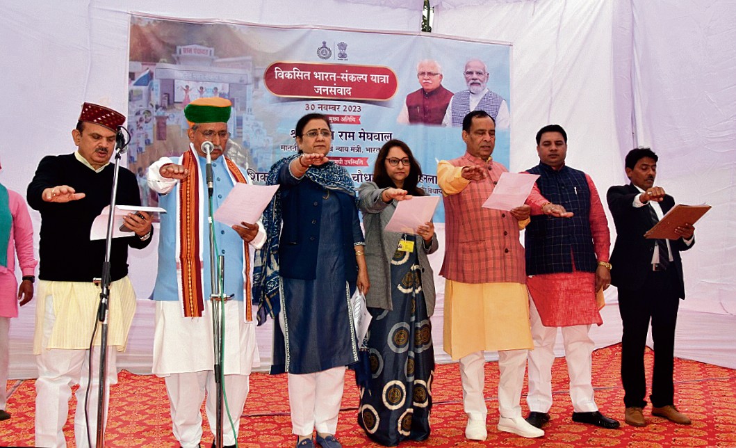 केंद्रीय कानून मंत्री अर्जुनराम मेघवाल ने गांव बैंयापुर में ‘विकसित भारत-संकल्प यात्रा’ का शुभारंभ किया। गांव बैंयापुर में आयोजित कार्यक्रम में केंद्रीय कानून मंत्री अर्जुनराम मेघवाल ने गांव के सोशल मीडिया फेम अंकित बैंयापुरिया को याद किया और कहा कि प्रधानमंत्री नरेंद्र मोदी ने भारत को विकसित बनाने का संकल्प लिया है। उन्होंने ग्रामीणों को संकल्प दिलाया कि वे अपने गांव को विकसित गांव बनायेंगे। हर एक गांव, नगर पालिका, नगर परिषद व नगर निगम को विकसित बनायेेंगे, जिससे देश विकसित बनेगा। इस अवसर पर सांसद रमेश कौशिक, राई हलका विधायक एवं भाजपा के प्रदेश महामंत्री मोहनलाल बड़ौली, गन्नौर की विधायक निर्मल चौधरी ने भी जनसमूह को संबोधित किया। केंद्रीय मंत्री अर्जुनराम मेघवाल ने वरिष्ठ वर्ग के तहत रंगोली में मीनाक्षी, नेहा, राहुल प्रथम, द्वितीय और तृतीय स्थान प्रदान किया।