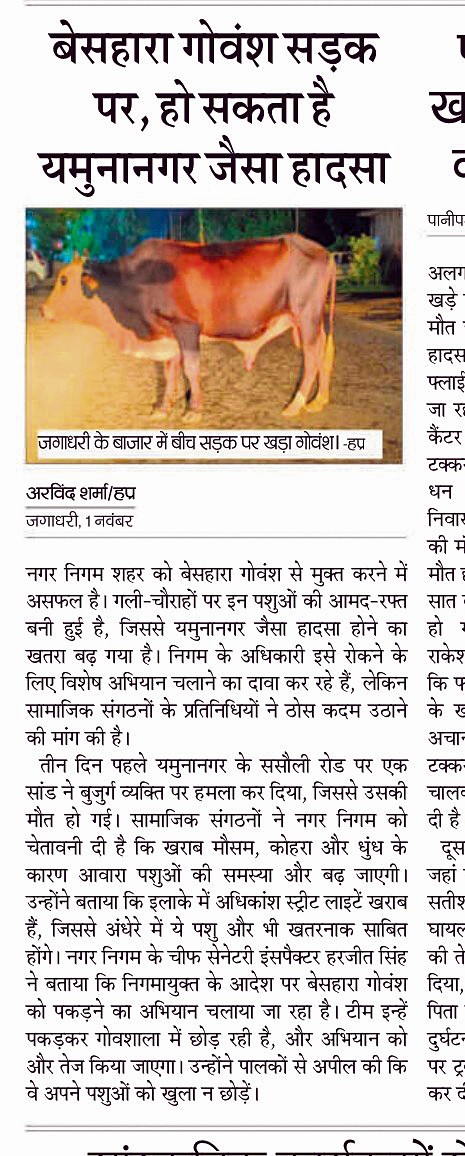 शहर में लावारिस गौवंशों के खुले में घूमने से संभावित दुर्घटनाओं को देखते हुए नगर निगम ने इस पर त्वरित कार्रवाई की है। दैनिक ट्रिब्यून ने यह मुद्दा एक नवंबर को प्रमुखता से उठाया था, जिसमें बताया गया था कि लावारिस गौवंशों के कारण यमुनानगर जैसी घटना यहां भी घट सकती है। मंगलवार को नगर निगम ने जगाधरी जोन में एक विशेष अभियान चलाया। सीएसआई हरजीत सिंह के नेतृत्व में नगर निगम की टीम ने जगाधरी के विभिन्न मार्गों और कॉलोनियों में घूम रहे लावारिस गौवंशों को पकड़ा और उन्हें श्री गौशाला कमेटी, मटका चौक में पहुंचाया। निगमायुक्त आयुष सिन्हा के निर्देशानुसार, यह अभियान नगर निगम के दोनों जोनों में जारी है। सीएसआई हरजीत सिंह, एसआई अमित कंबोज और उनकी टीम ने सबसे पहले जगाधरी बस स्टैंड, अम्बाला रोड, यमुनानगर रोड, पांवटा रोड और रेलवे रोड पर गौवंशों को पकड़ा। निगम की टीम ने गौवंशों को वाहन में चढ़ाकर सुरक्षित गोशाला पहुंचाया। इस अभियान में कुल दस लावारिस गौवंश पकड़े गए।