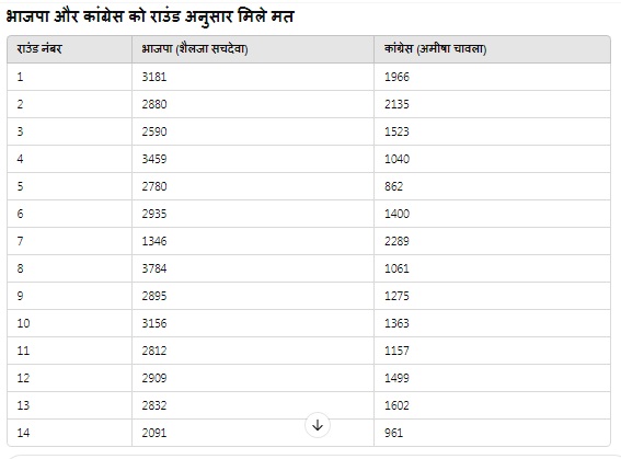 महत्वपूर्ण बात यह थी कि दोनों प्रत्याशी एक ही पंजाबी वर्ग से थे इसलिए जातिगत ध्रुवीकरण को लेकर भी कोई बड़ा अपडेट नहीं था। नगर निगम के मेयर उपचुनाव में 193260 मतदाताओं में से मात्र 61801 वोटरों ने अपने मताधिकार का प्रयोग किया था। आज हुई मतगणना में भाजपा की शैलजा को कुल मिलाकर 40620 मत, कांग्रेस की अमीषा चावला को 20133 मत तथा नोटा को 808 मत मिले।