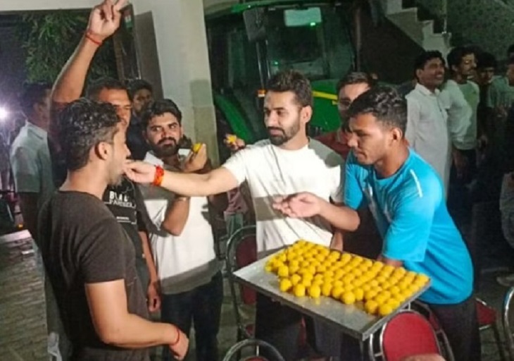 नीरज चोपडा के पैतृक गांव खंडरा में देर रात को लड्डू बांटकर मनाई जीत की खुशी