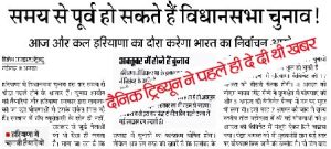 हरियाणा विधानसभा चुनाव के लिए अधिसूचना पांच सितंबर को जारी होगी। नामांकन 12 सितंबर तक दाखिल किए जा सकते हैं। चुनाव कार्यक्रम के अनुसार, नामांकन की छानबीन 13 सितंबर तथा नाम वापसी की आखिरी तारीख 16 सितंबर होगी। मतदान एक चरण में एक अक्तूबर को होगा तथा चार अक्तूबर को मतगणना होगी। दैिनक टि्रब्यून ने 12 अगस्त को ही विधानसभा चुनाव पहले कराये जाने संबंधी खबर दे दी थी।