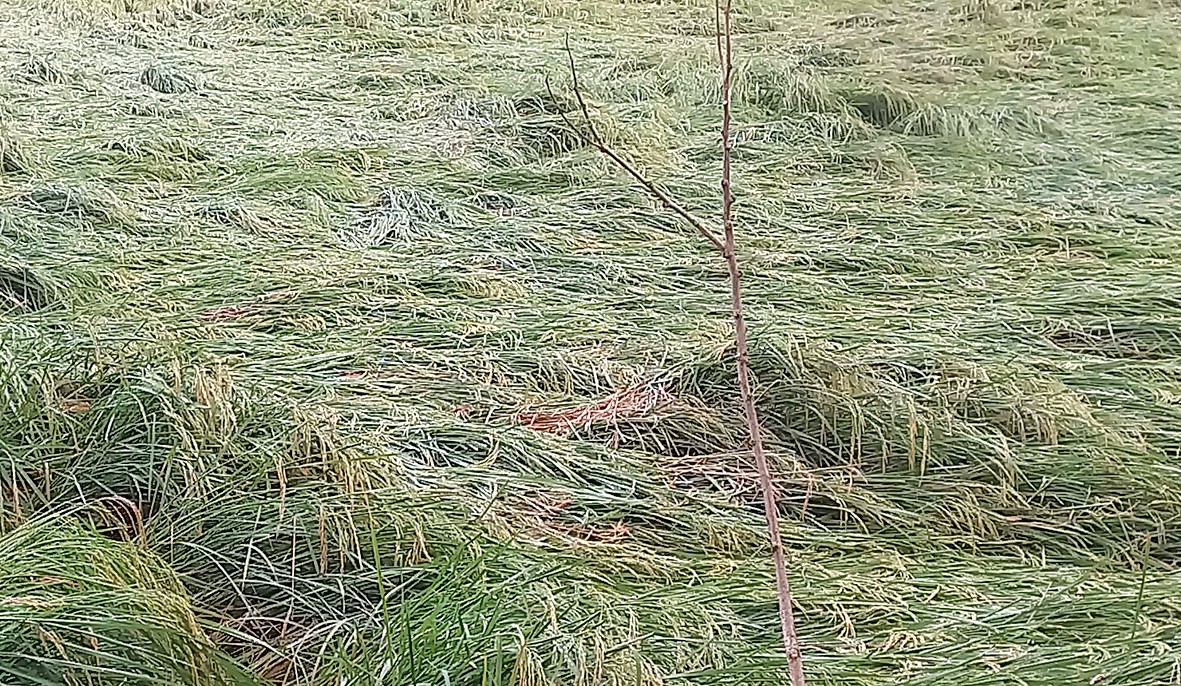 बरसात के साथ चली हवा से धान की फसल जमीन पर बिछी
