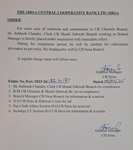 Haryana News : कॉपरेटिव बैंक सिरसा की चौटाला शाखा के प्रबंधक सस्पेंड, सहकारिता मंत्री ने लिया एक्शन
