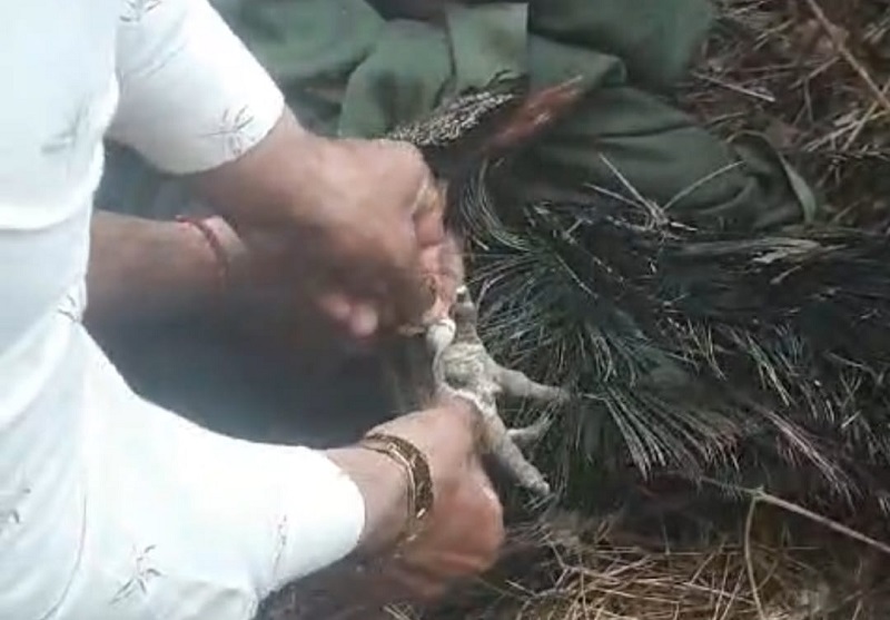 ग्रामीणों ने बड़ी मशक्कत के साथ पेड़ से नीचे उतारा और दोनो पैरों पर बंधे हुए कपड़े को ब्लेड की मदद से काट कर उसके पैरों को खोला गया। कपड़ा बंधे होने के कारण मोर को उड़ने में काफी दिक्कत हो रही थी, जिसके कारण मोर आज पेड़ पर उल्टा लटका मिला। मोर के पैरों में सुजन बनी हुई थी पैर लाल होकर चोटिल हो चुके थे।