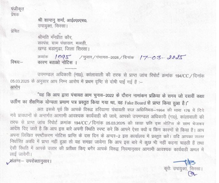 Haryana News : बड़ागुढ़ा ब्लॉक के गांव मलड़ी की सरपंच मनप्रीत कौर का 10वीं कक्षा का सर्टिफिकेट संदिग्ध पाए जाने पर जिला उपायुक्त की तरफ से कारण बताओ नोटिस जारी किया गया है। जारी किए गए पत्र में कहा गया है कि पंचायत आम चुनाव 2022 के दौरान नामांकन प्रक्रिया के समय जो 10वीं कक्षा उर्तीण का शैक्षणिक योग्यता प्रमाण पत्र प्रस्तुत किया गया था, वह एसडीएम कालांवाली की जांच में नकली बोर्ड से प्राप्त किया हुआ पाया गया है।