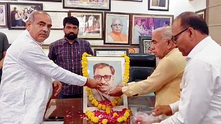 कैबिनेट मंत्री मूलचंद शर्मा पण्डित दीनदयाल उपाध्याय के चित्र पर पुष्प अर्पित करते हुए। साथ हैं पं. टिपरचंद शर्मा व अन्य। -निस
