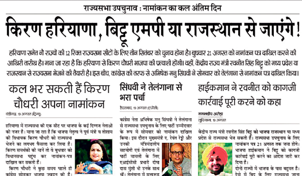 ट्रिब्यून न्यूज सर्विस चंडीगढ़, 20 अगस्त हरियाणा की पूर्व मंत्री किरण चौधरी का राज्यसभा जाना तय हो गया है। मंगलवार को उन्होंने विधानसभा की सदस्यता से इस्तीफा दे दिया और स्पीकर ज्ञानचंद गुप्ता ने हाथों-हाथ इसे मंजूर कर लिया। अब...