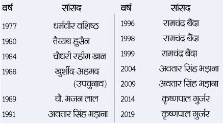 दिल्ली से सटा यह ऐसा लोकसभा क्षेत्र है, जिसमें कांग्रेस और भाजपा का दबदबा रहा है। भाजपा के रामचंद्र जांगड़ा यहां से जीत की हैट्रिक लगाने वाले पहले नेता रहे। उन्होंने 1996, 1998 और 1999 यानी लगातार तीन बार चुनाव जीता। पूर्व सांसद अवतार सिंह भड़ाना ने भी हैट्रिक लगाने की कोशिश की, लेकिन वे कामयाब नहीं हो सके। भड़ाना 2004 और 2009 में सांसद रहे लेकिन 2014 में वे हार गए। मौजूदा सांसद कृष्णपाल गुर्जर भी हैट्रिक लगाने की जुगत में है। 2014 और 2019 में वे सांसद बन चुके हैं।