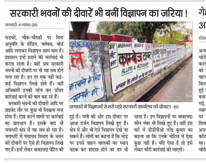 शहर में सरकारी भवनों की दीवारों पर अवैध रूप से विज्ञापन लिखने का मामला दैनिक ट्रिब्यून 11 नवंबर के अंक में प्रमुखता से उठाया था। समाचार में बताया गया था कि कई जगहों पर बिना मंजूरी के सरकारी भवनों की दीवारों पर कंपनियों, प्रतिष्ठानों आदि की मशहूरी के लिए विज्ञापन लिख रखे हैं। इसमें बीडीपीओ कार्यालय की दीवार पर तो आधा दर्जन से ज्यादा विज्ञापन लिखे होने की बात कही गई थी। मशहूरी करने वालों ने बाकायदा पेंटिंग कर विज्ञापन बना रखे थे। इस बारे में डीडीपीओ नरेंद्र कुमार ने जांच करने की बात कही थी।