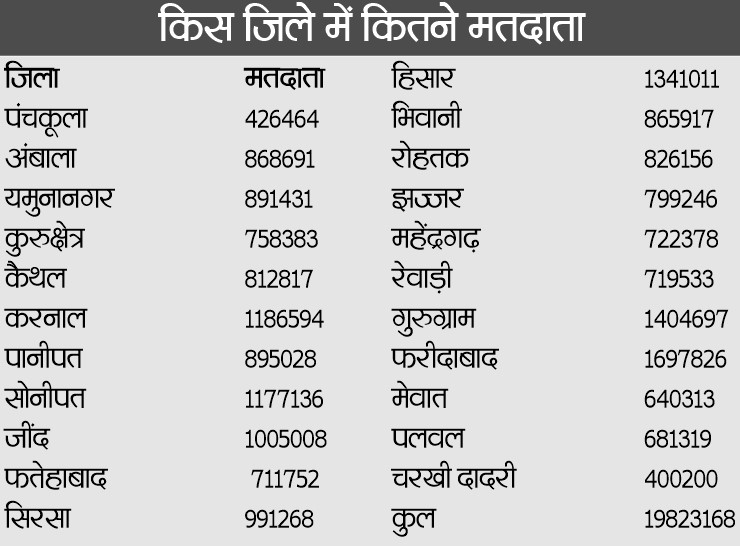 हरियाणा में लोकसभा की 10 सीटों के लिए छठे चरण में आमचुनाव होंगे। भारत के चुनाव आयोग द्वारा जारी किए गए शेड्यूल के तहत अंबाला, कुरुक्षेत्र, करनाल, सोनीपत, रोहतक, हिसार, सिरसा, भिवानी-महेंद्रगढ़, गुरुग्राम व फरीदाबाद सीटों के लिए 25 मई को मतदान होगा। मतगणना 4 जून को होगी। चुनाव में 1 करोड़ 98 लाख 23 हजार 168 मतदाता मताधिकार का इस्तेमाल कर सकेंगे।