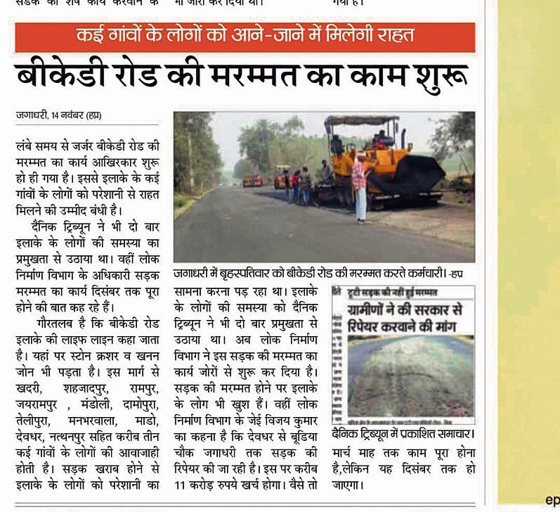बीकेडी रोड इलाके की लाइफ लाइन मानी जाती है। इससे क्रशर जोन के अलावा दर्जनों गांवों के किसानों की लकड़ी आदि की आवाजाही भी होती है। करीब तीन माह पहले इस सड़क की विशेष मरम्मत का कार्य शुरू हुआ था। करीब 11 करोड़ रुपये की लागत से सड़क देवधर से बूडिया चौक जगाधरी तक बननी है।