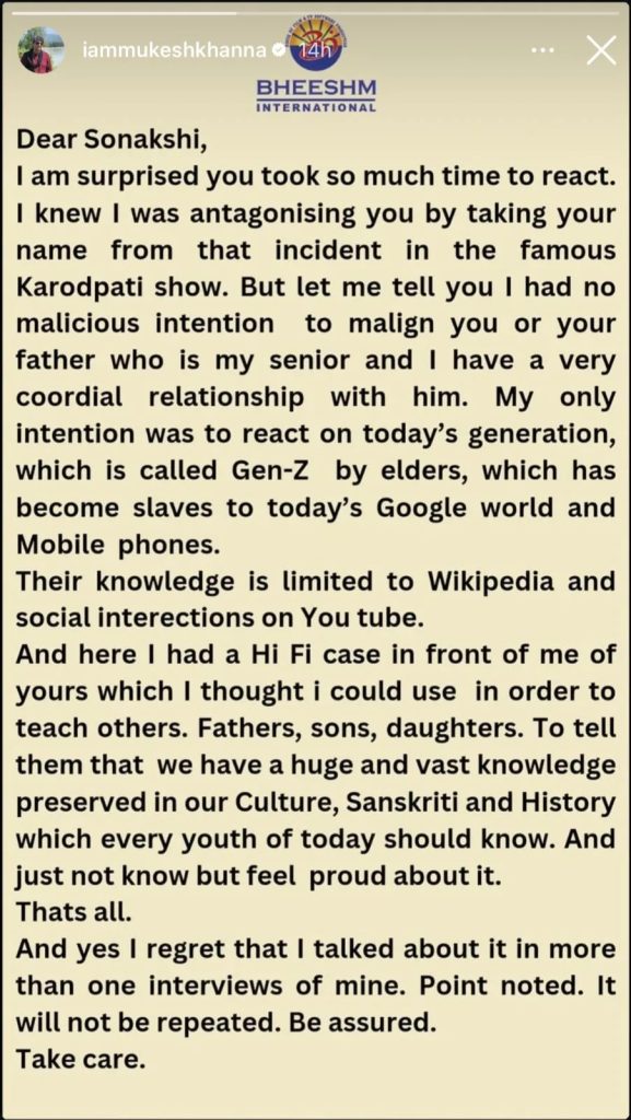 मुकेश खन्ना इंस्टाग्राम पर एक पोस्ट शेयर करते हुए, "डियर सोनाक्षी, मुझे आश्चर्य है कि आपने इतनी देर से प्रतिक्रिया दी। मैंने अभी 'कौन बनेगा करोड़पति' के एक मशहूर एपिसोड से जुड़ा एक उदाहरण दिया है। मेरा इरादा किसी को ठेस पहुंचाने का नहीं था, न ही मैं सोनाक्षी या उनके पिता को बदनाम करना चाहता था। जिस विषय पर मैंने बात की, वह महज शिक्षा देने का प्रयास था और मैं यह कहना चाहता था कि आज की युवा पीढ़ी का ज्ञान इंटरनेट और सोशल मीडिया तक ही सीमित है। वहीं, हमारे भारतीय इतिहास और संस्कृति में ज्ञान का अपार भंडार है।"
