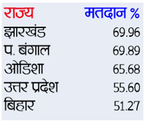 लोकसभा चुनाव के सातवें और अंतिम चरण में शनिवार को भीषण गर्मी के बीच 59.86 प्रतिशत मतदान दर्ज किया गया। पंजाब में 55.98, हिमाचल प्रदेश में 71 और चंडीगढ़ में 67.90 प्रतिशत मतदान हुआ। हिमाचल प्रदेश की छह और ओडिशा की 42 विधानसभा सीटों पर उपचुनाव के लिए भी वोटिंग हुई। इस बीच, पश्चिम बंगाल के संदेशखालि क्षेत्र में तृणमूल कांग्रेस और भाजपा समर्थकों के बीच हिंसा की घटनाएं सामने आईं। कुछ मतदान केंद्रों पर ईवीएम में गड़बड़ी और धांधली की शिकायतें दर्ज की गईं।