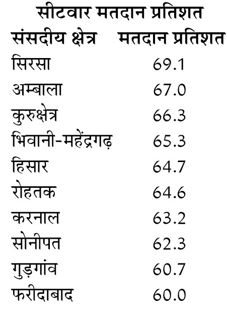 ''हरियाणा में मतदान शांतिपूर्ण तरीके से हुआ। प्रदेश में लोकसभा की दस सीटों के लिए 65 प्रतिशत के लगभग वोटिंग हुई। मतदान का डाटा अपडेट करने की प्रक्रिया जारी है। आंकड़े में थोड़ा बदलाव संभव है।''
