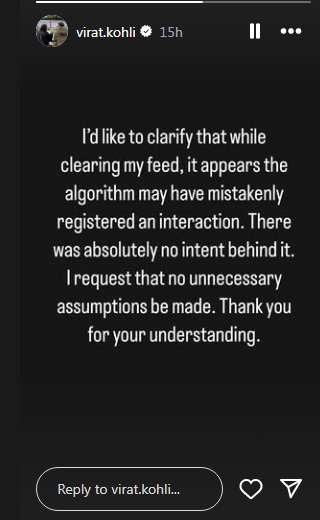इस घटनाक्रम ने जब तूल पकड़ा, तो विराट कोहली को खुद सामने आकर सफाई देनी पड़ी। उन्होंने अपनी इंस्टाग्राम स्टोरी में मोटे अक्षरों में लिखा, “मैं यह स्पष्ट करना चाहता हूं कि फीड क्लियर करते समय, ऐसा लगता है कि एल्गोरिदम ने गलती से कोई इंटरेक्शन रजिस्टर कर लिया है। इसके पीछे कोई इरादा नहीं था। कृपया कोई बेवजह की धारणा न बनाएं। समझने के लिए धन्यवाद।”