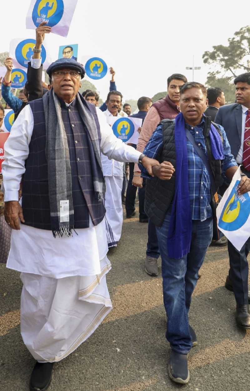 विपक्षी दलों के सांसदों ने संसद के निकट विजय चौक से संसद भवन तक मार्च किया। उन्होंने बाबासाहेब की तस्वीर वाली तख्तियां लेकर नारेबाजी की। उन्होंने ‘जय भीम', "अमित शाह इस्तीफा दो'' और "अमित शाह माफी मांगो'' के नारे लगाए। कांग्रेस महासचिव प्रियंका गांधी वाद्रा, पार्टी के कई सांसद, द्रमुक सांसद कनिमोझी, राष्ट्रीय जनता दल की नेता मीसा भारती, झारखंड मुक्ति मोर्चा की सांसद महुआ माझी और ‘इंडिया' गठबंधन के कुछ अन्य घटक दलों के नेता इस विरोध प्रदर्शन में शामिल हुए।
