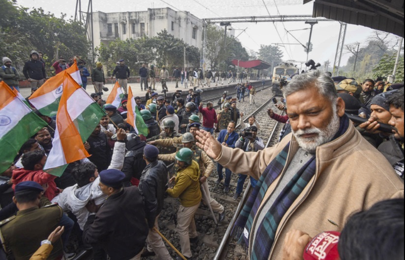 इसी बीच, शुक्रवार को पूर्णिया से निर्दलीय सांसद राजेश रंजन उर्फ पप्पू यादव ने अपने समर्थकों के साथ पटना सचिवालय हाल्ट पर रेल पटरियों पर धरना दिया। शुक्रवार की सुबह सचिवालय हॉल्ट रेलवे स्टेशन पर बड़ी संख्या में यादव समर्थक एकत्र हुए और रेल की पटरी पर बैठ गए तथा ट्रेनों की आवाजाही को बाधित करने का प्रयास किया।