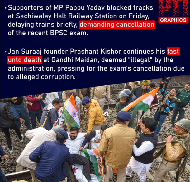 बीपीएससी के मुद्दे को लेकर यादव के अपने समर्थकों के साथ रेल और राष्ट्रीय राजमार्ग रोको अभियान की घोषणा के मद्देनजर सचिवालय हॉल्ट रेलवे स्टेशन पर बड़ी संख्या में सुरक्षाकर्मियों को तैनात किया गया है, ताकि यह सुनिश्चित किया जा सके कि प्रदर्शनकारी ट्रेनों की आवाजाही को बाधित न कर सकें। इस अवसर पर पत्रकारों से बातचीत करते हुए यादव ने कहा कि उन्होंने राज्यपाल से लेकर प्रदेश में हर स्तर पर छात्रों के मुद्दे का हल निकाले जाने का प्रयास किया पर सरकार सुनने को तैयार नहीं है।
