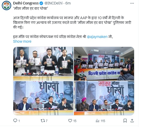 कांग्रेस ने दिल्ली विधानसभा चुनाव से कुछ सप्ताह पहले बुधवार को आम आदमी पार्टी सरकार और केंद्र की भारतीय जनता पार्टी (भाजपा) के नेतृत्व वाली सरकार के "काले कारनामों" के खिलाफ एक 'श्वेत पत्र' जारी किया और आरोप लगाया कि दिल्ली की दुर्दशा के लिए दोनों पार्टियां जिम्मेदार हैं। दिल्ली प्रदेश कांग्रेस कमेटी ने 'मौका-मौका, हर बार धोखा' शीर्षक से श्वेत पत्र जारी किया।