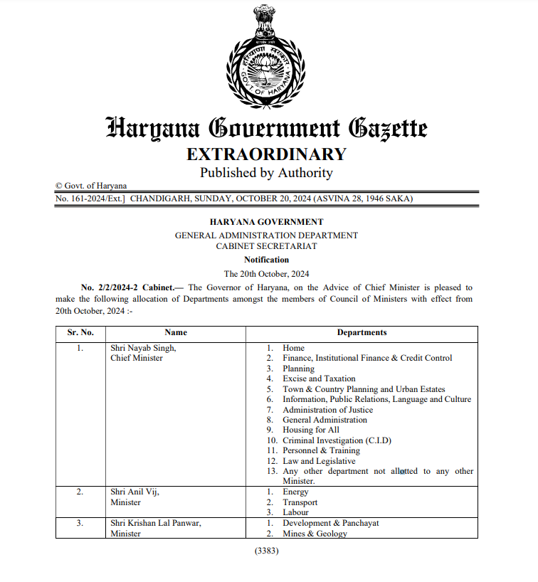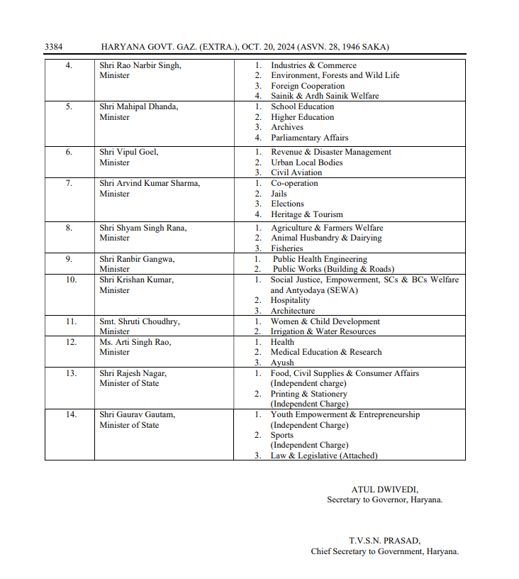 - मुख्यमंत्री नायब सिंह सैनीः गृह, वित्त, प्लानिंग, आबकारी एवं कराधान, टाउन एंड कंट्री प्लानिंग, सूचना एवं जनसंपर्क, प्रशासनिक न्याय, सामान्य प्रशासन, हाउसिंग फॉर ऑल, सीआईडी, लॉ एंड लेजिस्लेटिव, पर्सोनल एंड ट्रेनिंग।