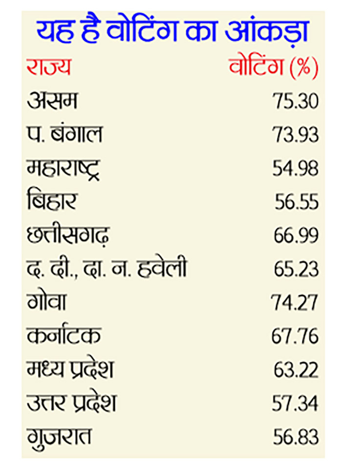 लोकतंत्र का सबसे बड़ा पर्व कहे जाने वाले मतदान में इस बार असम और गोवा के मतदाताओं का उत्साह काबिले तारीफ रहा। आम चुनाव के तीसरे चरण में कुल वोटिंग करीब 62 प्रतिशत हुई। सबसे ज्यादा 75.30% वोट असम में पड़े, जबकि 74.32 फीसदी वोटिंग के साथ गोवा दूसरे नंबर पर रहा। इसके बाद पश्चिम बंगाल रहा जहां वोटिंग 73.93 फीसदी हुई। महाराष्ट्र इस बार फिसड्डी रहा, जहां महज 54.98 प्रतिशत मतदाताओं ने अपने मताधिकार का प्रयोग किया। बिहार और गुजरात में थोड़ा सुधार हुआ। यहां करीब 57-57 प्रतिशत मतदान हुआ। उत्तर प्रदेश की 10 सीटों के लिए करीब 55.13 प्रतिशत मतदान दर्ज किया गया।