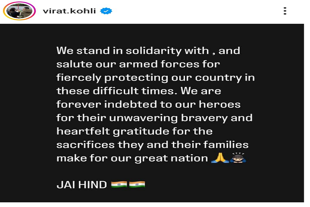 कोहली ने इंस्टाग्राम पेज पर लिखा कि हम इस कठिन समय में हमारे देश की रक्षा करने के लिए अपने सशस्त्र बलों के साथ एकजुटता से खड़े हैं और उन्हें सैल्यूट करते हैं। हम अपने नायकों की अटूट बहादुरी, उनके और उनके परिवारों द्वारा हमारे महान राष्ट्र के लिए किए गए बलिदानों के लिए तहेदिल से आभारी हैं।