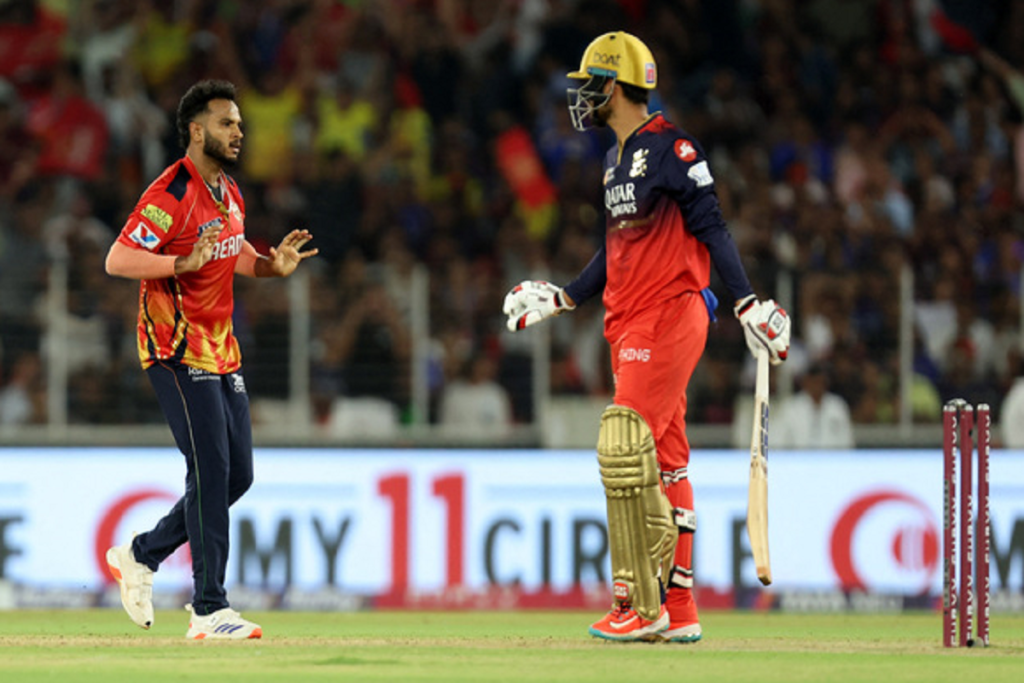 भुवनेश्वर सिंह ने नेहाल वढेरा (15) और मार्कस स्टोइनिस (छह) को तीन गेंद के भीतर 17वें ओवर में पवेलियन भेजा। इससे पहले अर्शदीप सिंह और काइल जैमीसन की अगुवाई में अपने गेंदबाजों के शानदार प्रदर्शन के दम पर पंजाब किंग्स ने रॉयल चैलेंजर्स बेंगलुरू को 9 विकेट पर 190 रन पर रोक दिया। आरसीबी के लिए कोहली 35 गेंद में 122 . 85 की स्ट्राइक रेट से 43 रन बनाकर आउट हो गए। कोहली ने अपनी पारी में सिर्फ 3 चौके लगाए। पावरप्ले में आरसीबी का स्कोर एक विकेट पर 55 रन था, लेकिन छठे से 11वें ओवर के बीच सिर्फ 42 रन बने। फिल साल्ट (16) ने पहले ओवर में एक छक्का और एक चौका लगाया।