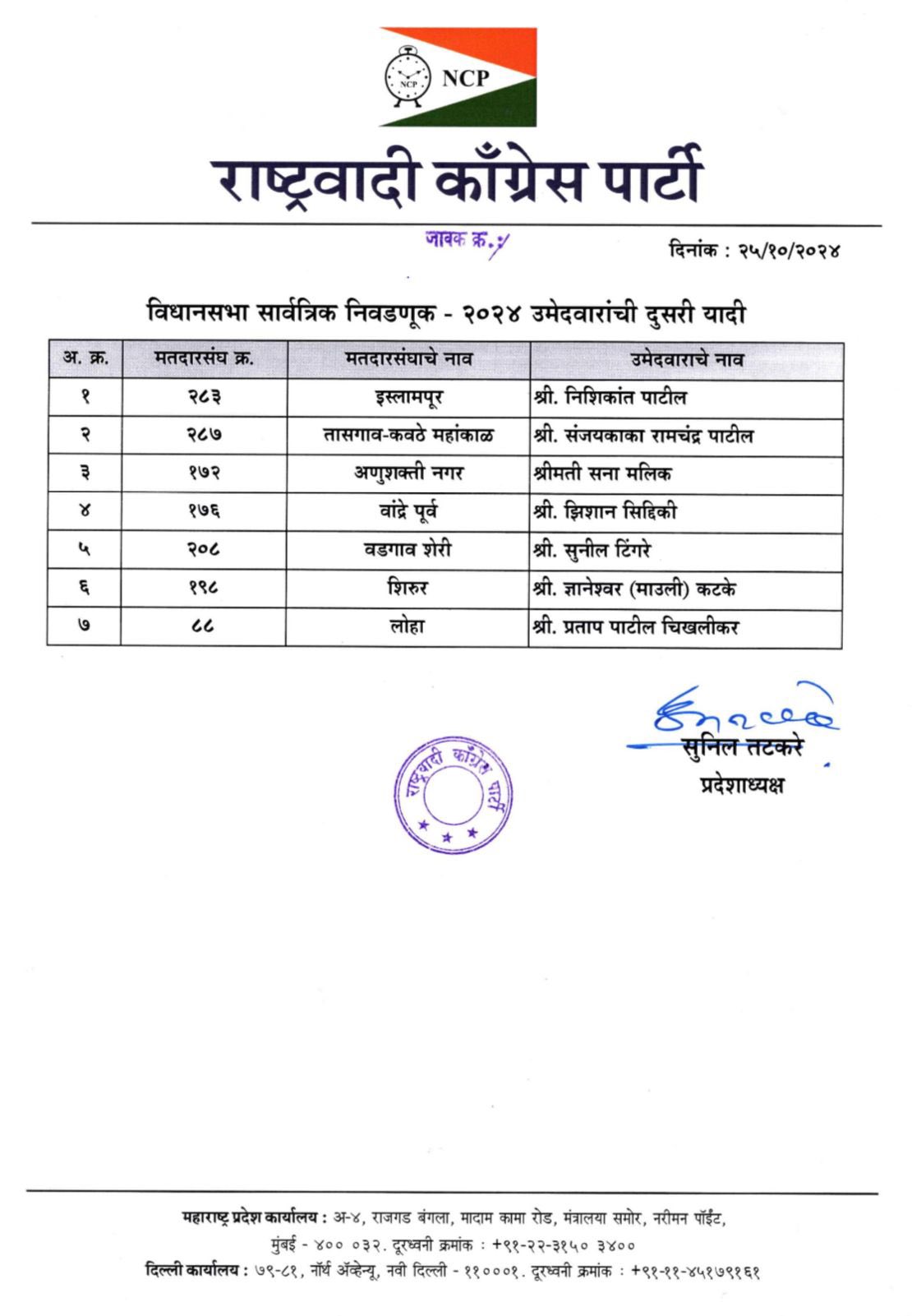 राकांपा ने पुणे में वडगांव शेरी से सुनील तिंगरे को टिकट दिया है। शिरुर से ज्ञानेश्वर कटके को टिकट दिया गया है। हाल तक कटके उद्धव ठाकरे की पार्टी के पुणे जिला प्रमुख थे। इससे पूर्व राकांपा ने 38 उम्मीदवारों की पहली सूची जारी की थी। राकांपा, भाजपा और एकनाथ शिंदे की अगुवाई वाली शिवसेना महाराष्ट्र में सत्तारूढ़ महायुति गठबंधन के घटक दल हैं। 288 सदस्यीय महाराष्ट्र विधानसभा के लिए 20 नवंबर को चुनाव होंगे और मतों की गिनती 23 नवंबर को होगी।