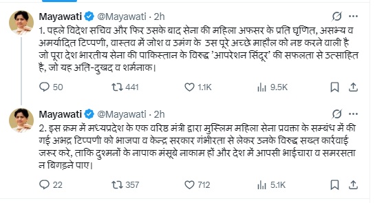 मायावती ने सोशल मीडिया मंच ‘एक्स' पर ‘पोस्ट' साझा करते हुए कहा कि जब पाकिस्तान के विरुद्ध भारतीय सेना के ‘आपरेशन सिंदूर' की सफलता से पूरा देश उत्साहित है तो ऐसे में ‘‘पहले विदेश सचिव और फिर सेना की महिला अफसर के प्रति घृणित, असभ्य एवं अमर्यादित टिप्पणी'' जोश के इस माहौल को वास्तव में खराब करने वाली है।
