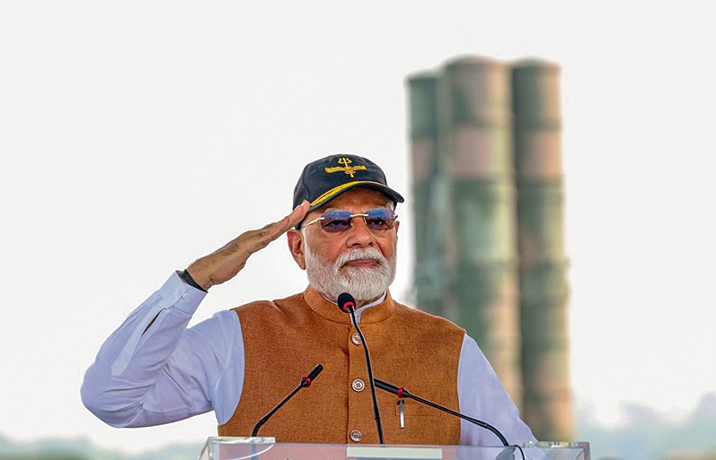 मोदी ने वायुसेना कर्मियों का अभिवादन किया। सैनिकों के साथ बातचीत के बाद, मोदी ने एस-400 मिसाइल प्रणाली के आगे खड़े होकर वायुसेना कर्मियों को संबोधित किया। मोदी ने कहा, ‘जब हमारी फौजें ‘न्यूक्लियर ब्लैकमेल’ की धमकी की हवा निकाल देती हैं तो आकाश से पाताल तक, एक ही बात गूंजती है भारत माता की जय।’ उन्होंने कहा कि जयघोष की ताकत अभी-अभी दुनिया ने देखी, ‘भारत माता की जय सिर्फ उद्घोष नहीं है। यह देश के हर उस सैनिक की शपथ है जो मां भारती की मान-मर्यादा के लिए जान की बाजी लगा देता है।’ उन्होंने ने कहा कि मैं थलसेना, वायुसेना और नौसेना कर्मियों को सलाम करता हूं।’ उन्होंने कहा कि आतंकवाद को पनाह देने वालों को यह अहसास हो गया है कि भारत पर बुरी नजर डालने का मतलब सिर्फ उनका विनाश होगा।