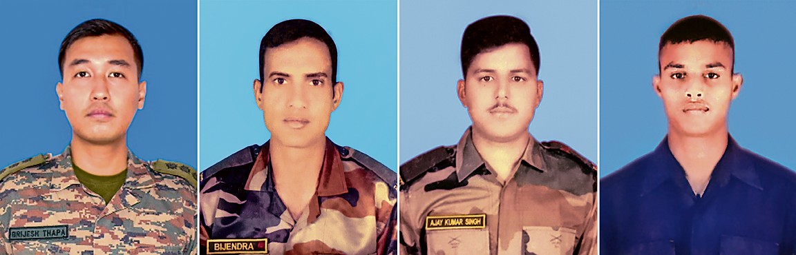 जम्मू-कश्मीर के डोडा जिले में भारी हथियारों से लैस आतंकवादियों के साथ मुठभेड़ में गंभीर रूप से घायल हुए एक कैप्टन समेत चार सैनिक शहीद हो गए। अधिकारियों ने मंगलवार को यह जानकारी देते हुए बताया कि आतंकियों की तलाश और उनके सफाये के लिए अतिरिक्त बल भेजा गया है। शहीद हुए सैनिकों की पहचान कैप्टन बृजेश थापा, नायक डी राजेश, सिपाही बिजेन्द्र और सिपाही अजय के रूप में हुई है।