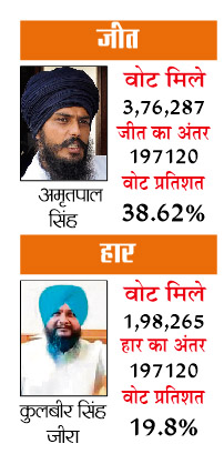 खडूर साहिब लोकसभा सीट पर खालिस्तानी समर्थक और निर्दलीय प्रत्याशी अमृतपाल को जीत हासिल हुई। अमृतपाल को 376287 वोट मिले हैं। उन्होंने कांग्रेस के कुलबीर सिंह जीरा को पराजित किया है। कुलबीर सिंह जीरा को 198265 वोट मिले है। तीसरे नंबर पर आम आदमी पार्टी के मंत्री लालजीत सिंह भुल्लर रहे, उन्हें 186665 वोट मिले हैं। अमृतपाल ने यह चुनाव असम जेल में बंद रहते हुए जीता है। उनका नामांकन कराने के लिए असम की जेल से जेल सुपरिटेंडेंट यहां आए थे।