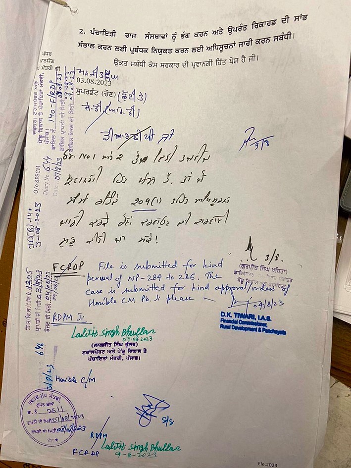 पंजाब में पंचायतें भंग करने का मामला गर्माता जा रहा है। उस फाइल की एक प्रति ऑनलाइन सामने आई है, जिसके आधार पर पंजाब में पंचायतों के चुनावों की घोषणा की गई थी। फाइल में मुख्यमंत्री भगवंत मान और ग्रामीण विकास मंत्री लालजीत भुल्लर के अलावा उन दो आईएएस अधिकारियों के हस्ताक्षर हैं, जिन्हें बृहस्पतिवार को पंचायत चुनाव विवाद में निलंबित कर दिया गया था। जिन अधिकारियों के हस्ताक्षर हैं, उनमें ग्रामीण विकास व पंचायत विभाग के वित्त आयुक्त रहे डीके तिवारी और विभाग के निदेशक गुरप्रीत सिंह खैरा शामिल हैं।