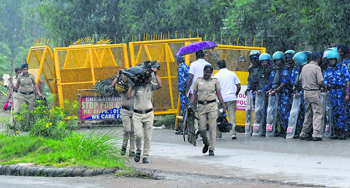 वाहनों की तलाशी जारी चंडीगढ़ में सभी प्रवेश एवं निकास बिंदुओं पर सुरक्षा कर्मी तैनात किए गए हैं। पुलिस ने कई स्थानों पर अवरोधक लगाए हैं और वहां से गुजर रहे वाहनों की तलाशी ली जा रही है। जगह-जगह दंगा-रोधी वाहनों को तैनात किया गया है। तलाशी अभियान के दौरान कई जगह पुलिस बेरिकेड के पास जाम की स्थिति का सामना आम लोगों को करना पड़ रहा है।