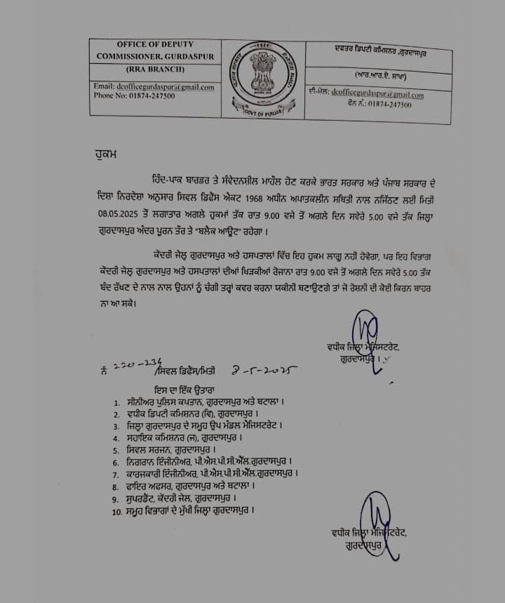 Gurdaspur Mock Drill : पंजाब के सीमावर्ती जिला गुरदासपुर में आगमी आदेशों तक रात नौ बजे से सुबह पांच बजे तक ब्लैक आउट रहेगा। गुरदासपुर के जिला उपायुक्त ने गुरुवार को इस संबंध में आदेश जारी किए।