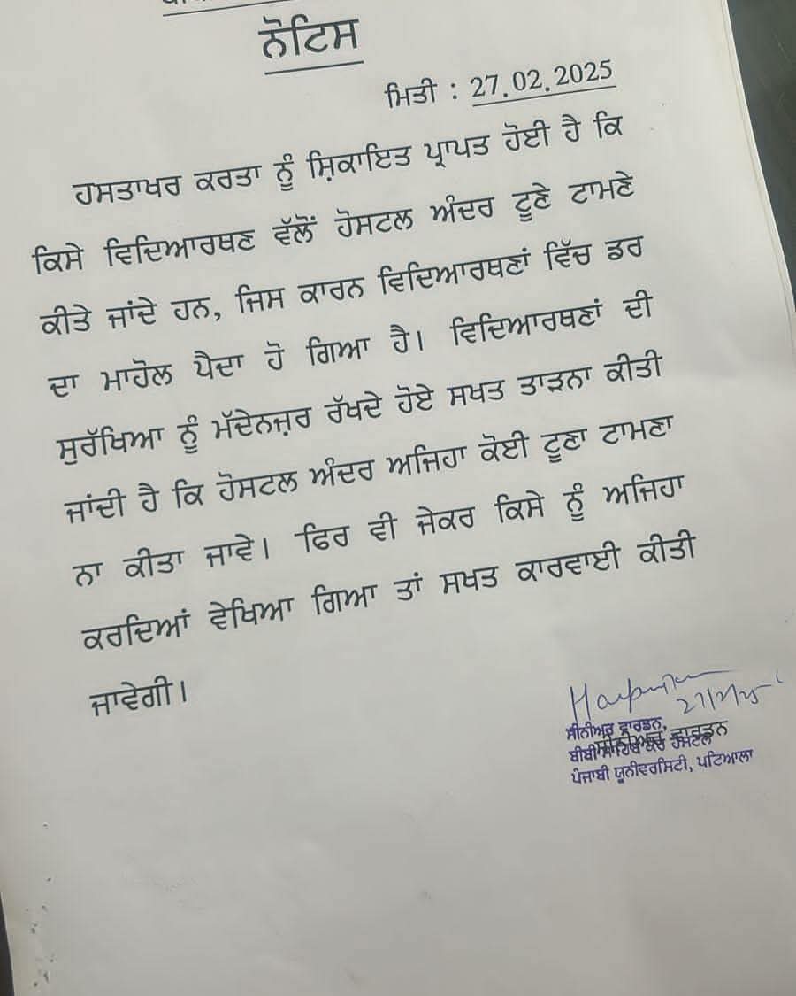 जानकारी मिलने के बाद छात्रावास वार्डन हरप्रीत ने विश्वविद्यालय प्रशासन को इस घटना से अवगत कराया। वार्डन द्वारा जारी नोटिस में कहा गया है कि कुछ छात्राएं टोना-टोटका जैसी गतिविधियों में लिप्त पाई गई हैं, जिससे छात्रावास में भय का माहौल बन गया है। छात्रों की सुरक्षा को ध्यान में रखते हुए, वार्डन ने सख्त चेतावनी दी है कि छात्रावास परिसर में ऐसी किसी भी गतिविधि को बर्दाश्त नहीं किया जाएगा।