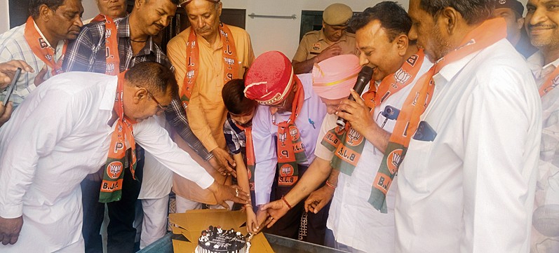 इंद्री में विधायक रामकुमार कश्यप ने केक काट कार्यकर्ताओं को दी बधाई