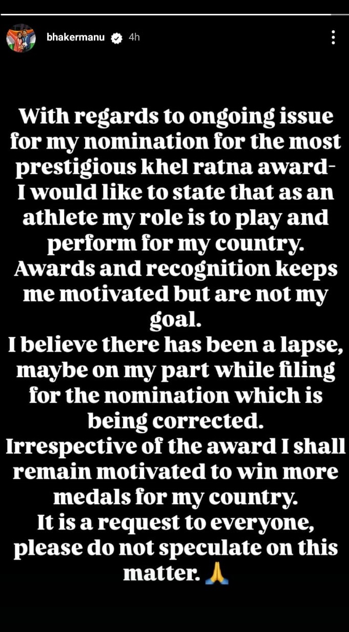 इससे पहले. मनु के पिता राम किशन का भी इस पर बयान सामने आया है। उन्होंने कहा कि पुरस्कार के लिए अपना नाम ऑनलाइन पोर्टल में जमा किया था, फिर भी 30 नामों की शॉर्टलिस्ट में जगह बनाने में विफल रहीं। मुझे उन्हें निशानेबाजी के खेल में जाने के लिए प्रेरित करने का पछतावा है। मुझे इसके बजाय मनु को क्रिकेटर बनाना चाहिए था। सभी पुरस्कार और प्रशंसा उन्हें मिल जाती।