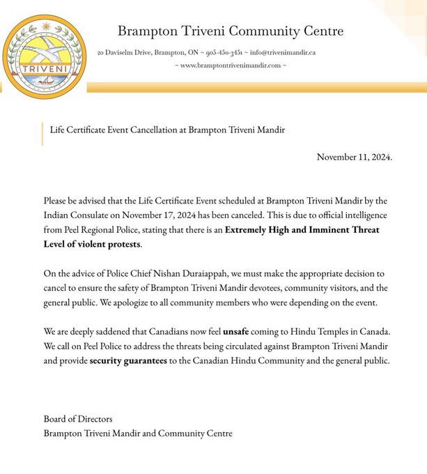 Canada News: ब्रैम्पटन के त्रिवेणी मंदिर में 17 नवंबर को प्रस्तावित ‘लाइफ सर्टिफिकेट इवेंट’ को हिंसक प्रदर्शन की धमकियों के चलते रद्द कर दिया गया है। मंदिर प्रशासन ने सोमवार को जारी बयान में कहा, "पील क्षेत्रीय पुलिस से मिली आधिकारिक जानकारी के अनुसार, आयोजन के दौरान हिंसक प्रदर्शन की बेहद उच्च और आसन्न खतरे की संभावना है, जिसके कारण इस कार्यक्रम को रद्द किया गया है।"