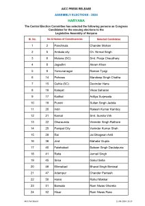 कांग्रेस ने लम्बे इंतजार के बाद नामांकन-पत्र दाखिल करने से कुछ घंटे पहले प्रत्याशियों की दो सूचियां जारी की। इनमें से एक सूची में 40 प्रत्याशियों के नाम हैं और दूसरी में पांच के नाम। इससे पहले पार्टी 41 विधानसभा क्षेत्रों के उम्मीदवारों के नामों का ऐलान कर चुकी है। पार्टी के आपसी खींचतान के चलते चार सीट अभी भी होल्ड हैं। राज्यसभा सांसद रणदीप सिंह सुरजेवाला के बेटे आदित्य सुरजेवाला कैथल और हिसार से सांसद जयप्रकाश उर्फ जेपी के बेटे विकास सहारन को कलायत से टिकट दिया है।
