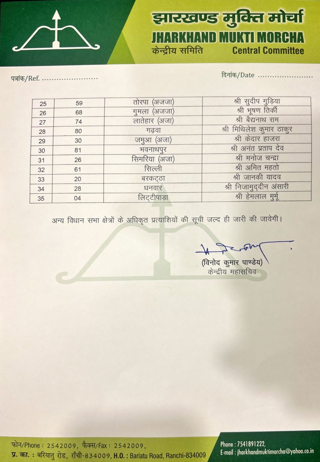 झामुमो की ओर से जारी उम्मीदवारों की सूची में चाईबासा से दीपक बिरुआ और जमुआ से भाजपा के तीन बार के विधायक रहे केदार हजारा (Kedar Hazara) शामिल हैं। हजारा हाल में पार्टी में शामिल हुए हैं।