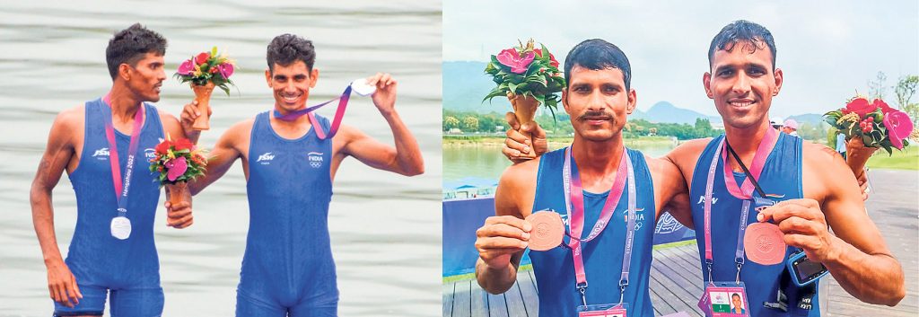 वहीं, भारतीय नौकायन खिलाड़ियों ने भी शानदार शुरुआत करते हुए दो रजत और एक कांस्य पदक जीता। अर्जुन लाल जाट और अरविंद सिंह ने पुरुष लाइटवेट डबल स्कल स्पर्धा में रजत पदक जीतकर भारत का खाता खोला। भारतीय जोड़ी 6:28.18 सेकंड का समय निकालकर दूसरे स्थान पर रही। पुरुषों की ‘कॉक्स एट’ स्पर्धा में भारत और चीन के बीच कड़ा मुकाबला था, जिसमें भारतीय टीम 5:43.01 सेकंड का समय निकालकर दूसरे स्थान पर रही। रजत जीतने वाली इस भारतीय टीम में पंजाब के जसविंदर सिंह और चरणजीत सिंह के अलावा नीरज, नरेश कलवानिया, नीतिश कुमार, भीम सिंह, पुनीत कुमार और आशीष शामिल थे। वहीं ‘कॉक्सलेस पेयर’ में बाबूलाल यादव और लेख राम को कांस्य पदक मिला, जिन्होंने 6:50.41 सेकंड का समय निकाला।
